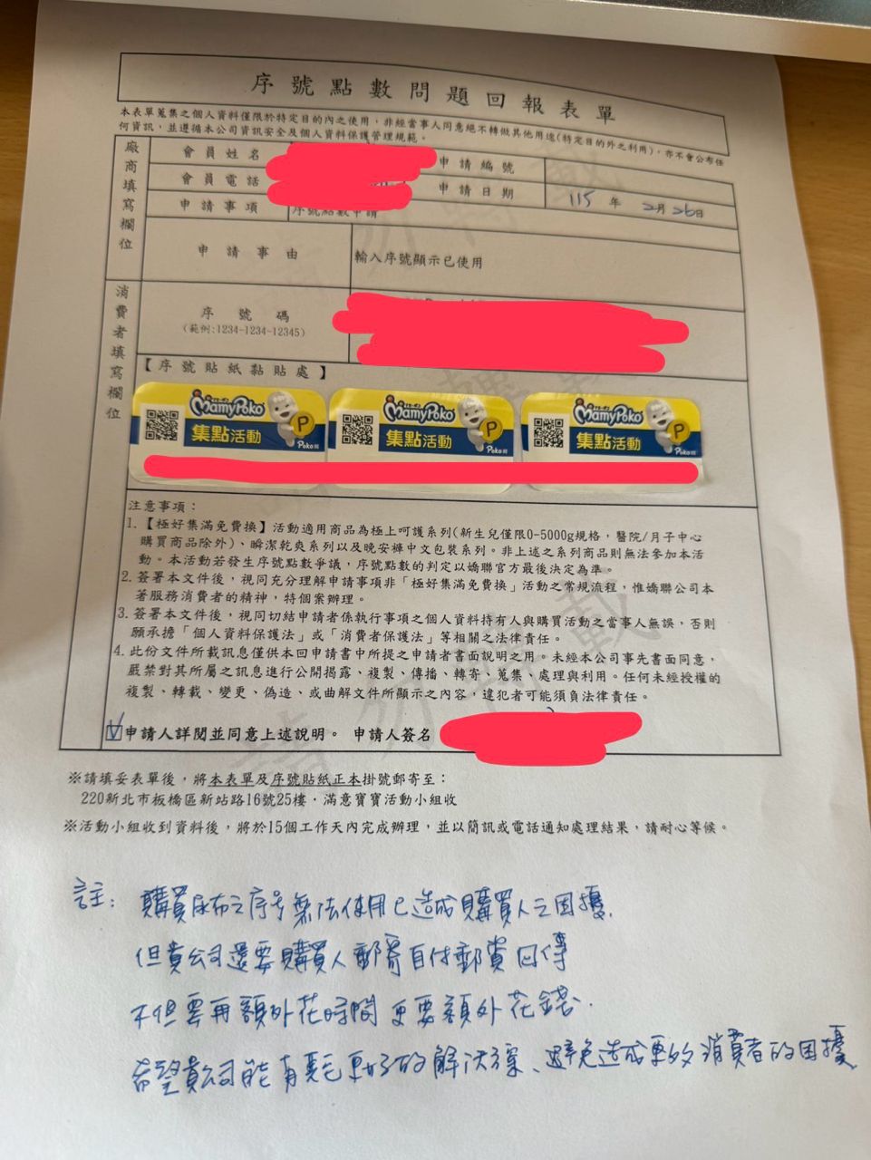 我告訴客服: 我買到不能集點的尿布已經造成我的困擾, 還要額外花時間花心力將申請資