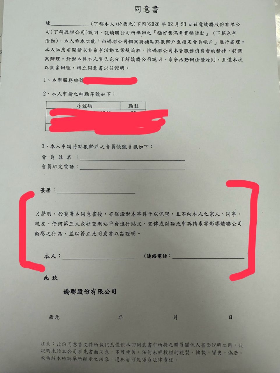 客服又表示可以個案幫我處理, 要我簽屬文件後再寄回嬌聯公司給他們, 如下圖, 實在是