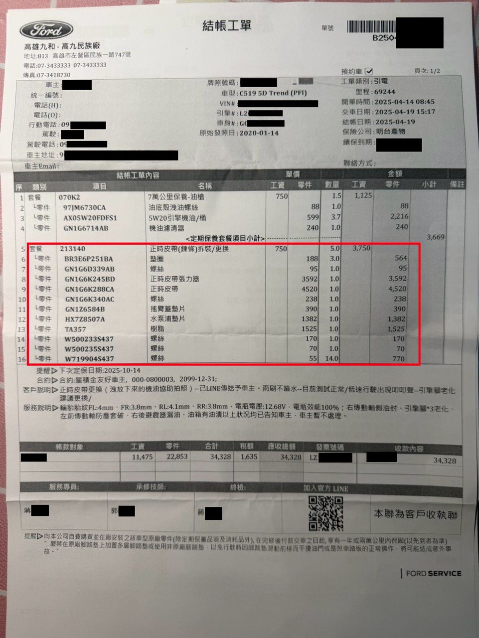 附上原廠更換正時皮帶紀錄,讓您安心再開8萬公里不用更新。