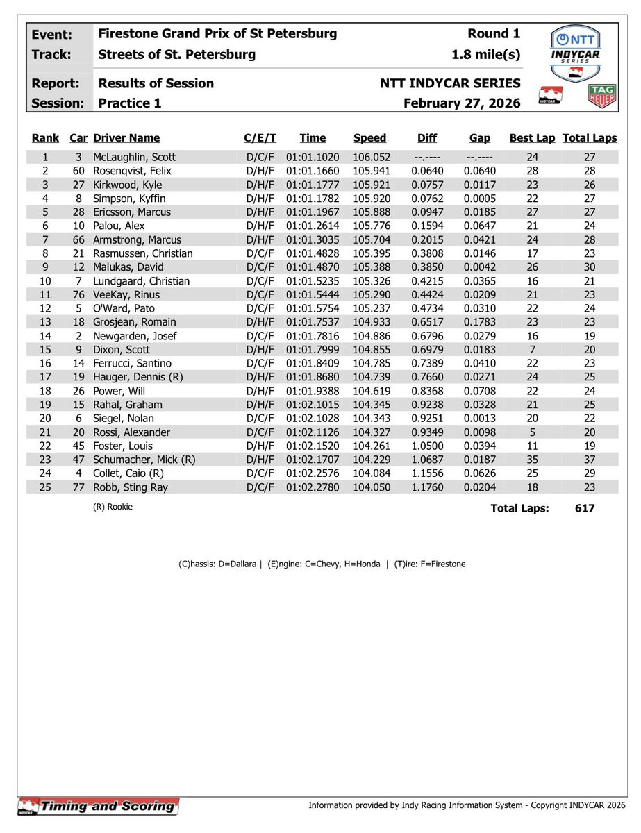 FP1 Scott McLaughlin 第一, ERI第五, 果醬第13, Mick 第23