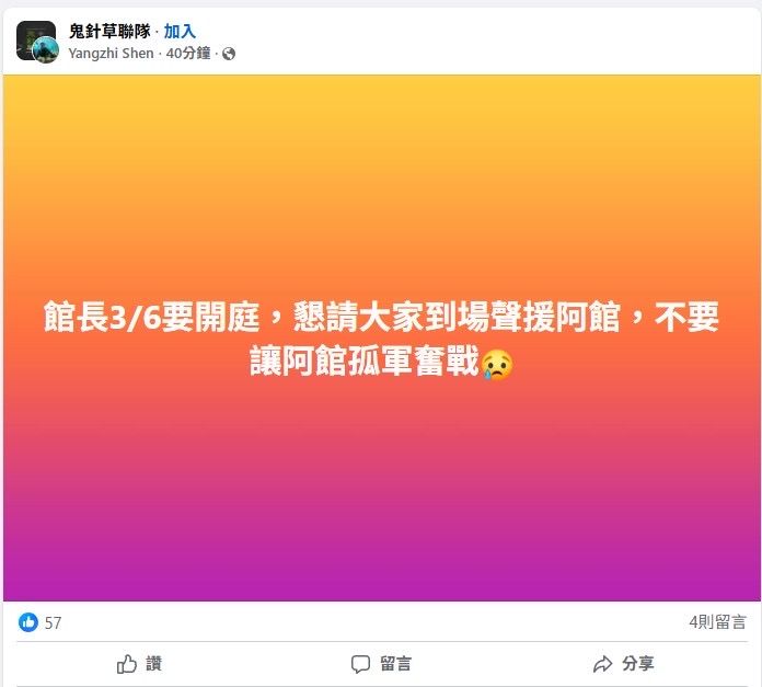 館長3/6要開庭,小草群組正在發文找人當天一起去幫阿館加油打氣。