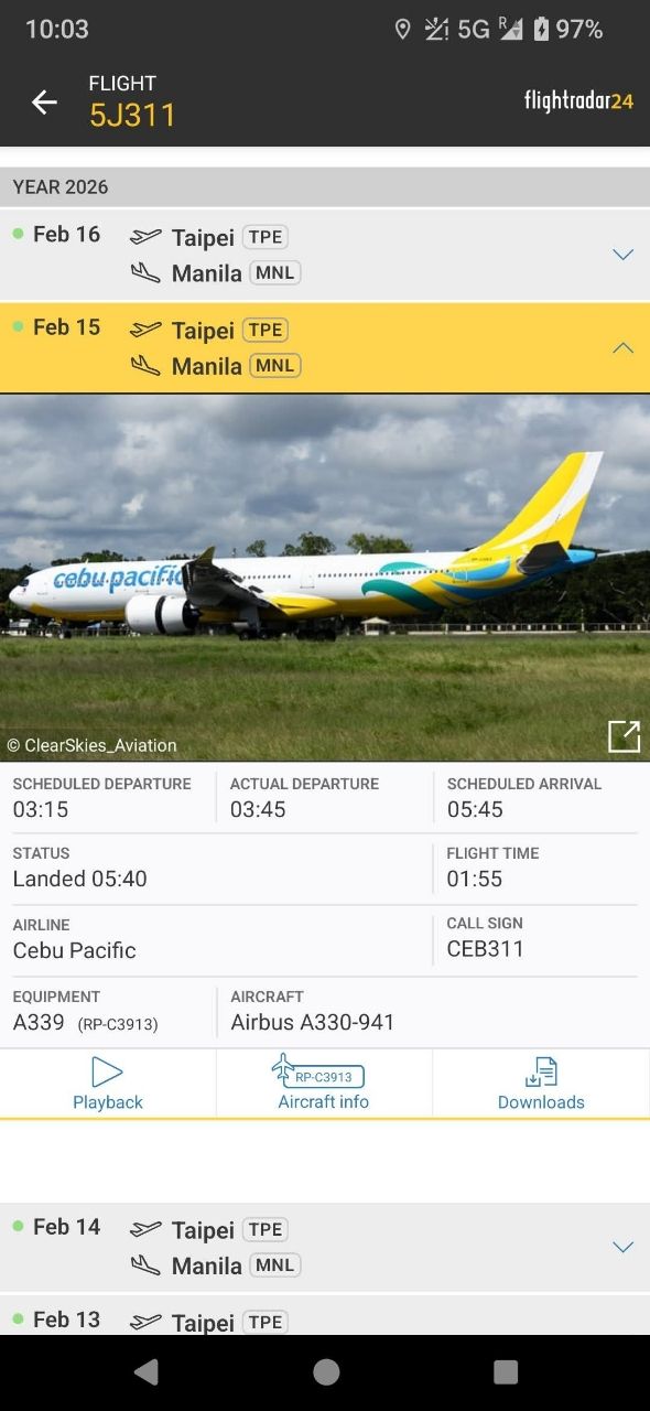 5J311航班半夜03:15分飛馬尼拉