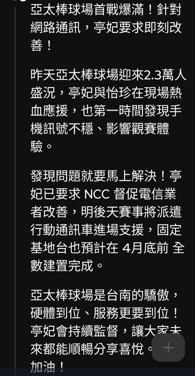 期盼其他電信業者,希望球團與業者能針對接下來亞太球場的賽事進行訊號優化,別讓全