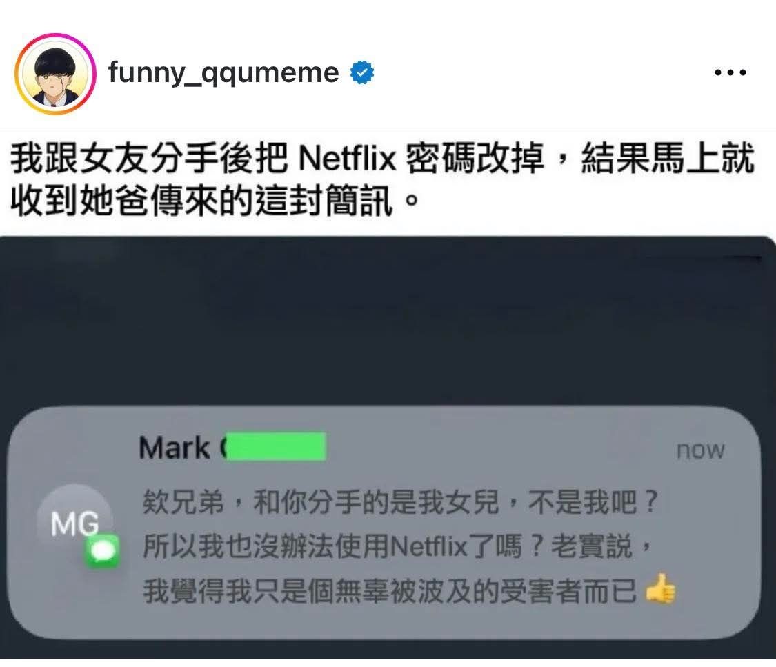 跟女友分手後 改掉Netflix密碼 結果 收到她爸傳訊息 :欸兄弟!跟你分手的是我女兒不是我吧! :我覺得我只是無辜被波及的受害者 -- ※ 發信站: 批踢踢實業坊(ptt.cc), 來自: 101.10.8.44 (臺灣) ※ 文章網址: https://www.ptt.cc/bbs/Marginalman/M.1775186416.A.709.html
