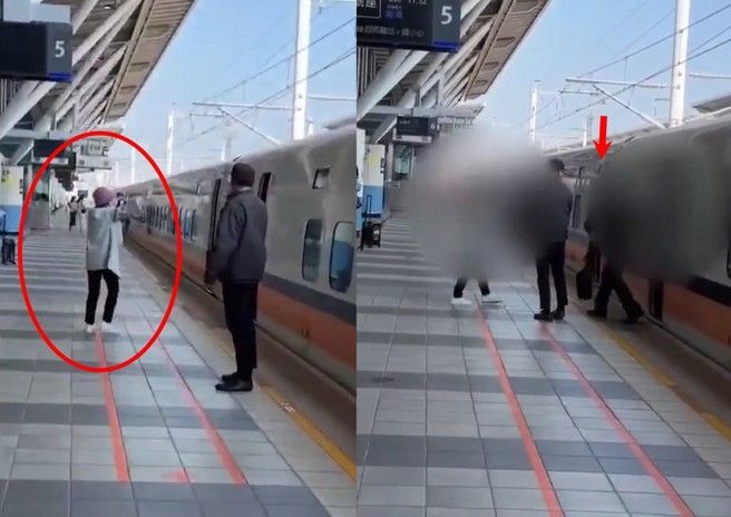 高鐵站務人員見狀,立即吹哨警告,並上前勸導婦人退回安全區域,但婦人仍然非常焦急