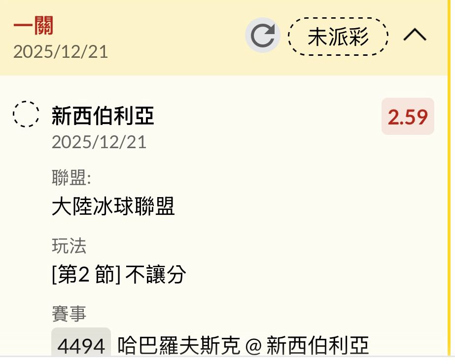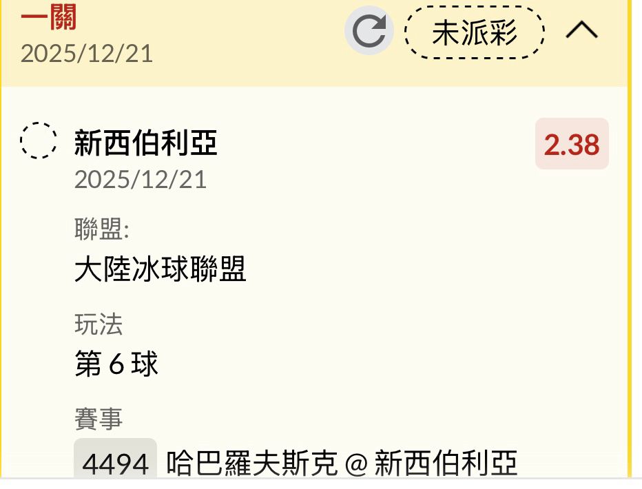 哈巴羅夫斯克@新西伯利亞 2-4 Q1 0-1 Q2 1-2 Q3 1-1 ----- Sent from JPTT on my iPhone -- ※ 發信站: 批踢踢實業坊(ptt.cc), 來自: 223.141.159.205 (臺灣) ※ 文章網址: https://www.ptt.cc/bbs/SportLottery/M.1766316039.A.FD1.html