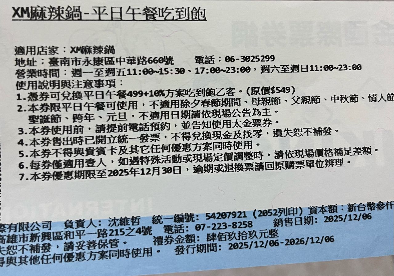 推 baudrons: [售]XM麻辣鍋中華店平日午餐吃到飽$499-1張。優惠期限 12/15 20:35
