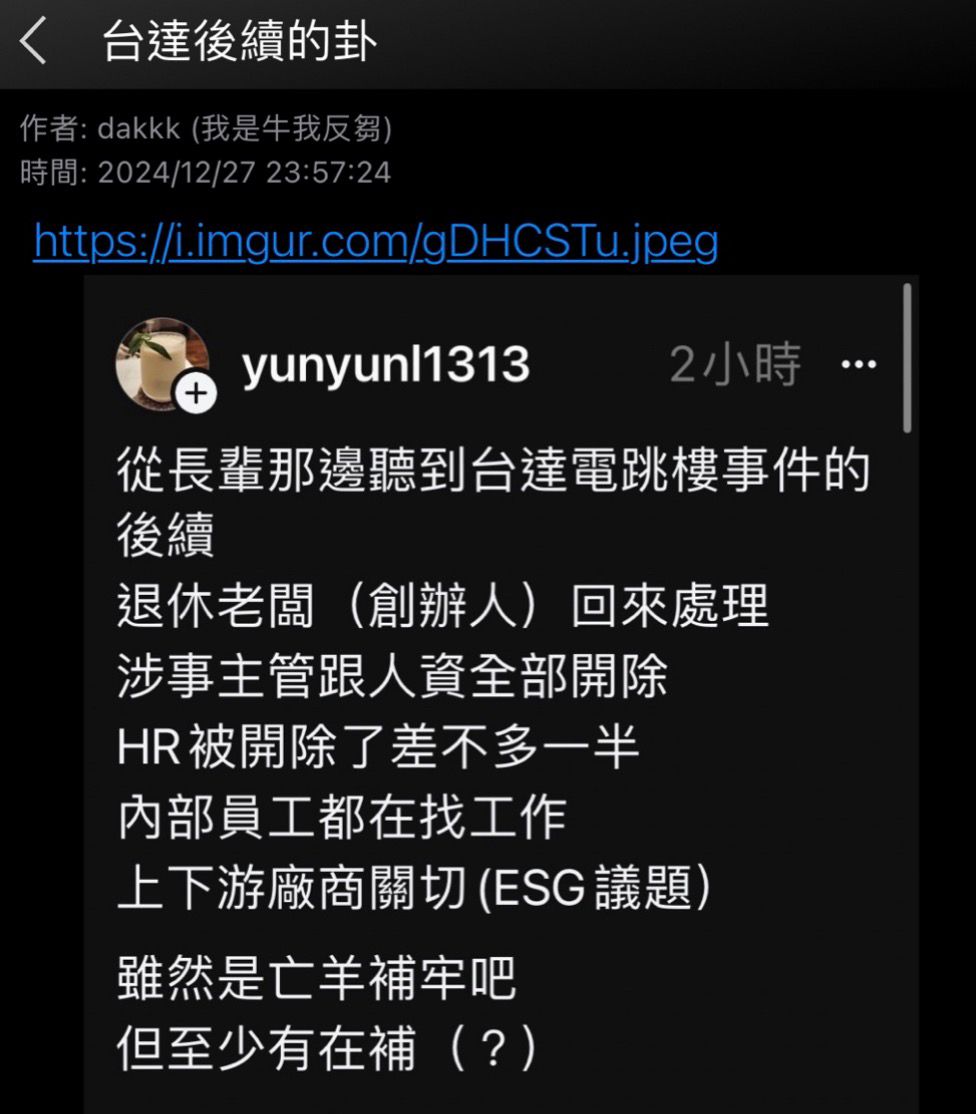 噓 vbn45660518: 整個台灣只有台達電知道當事人是誰 39.12.136.3 12/22 21:25