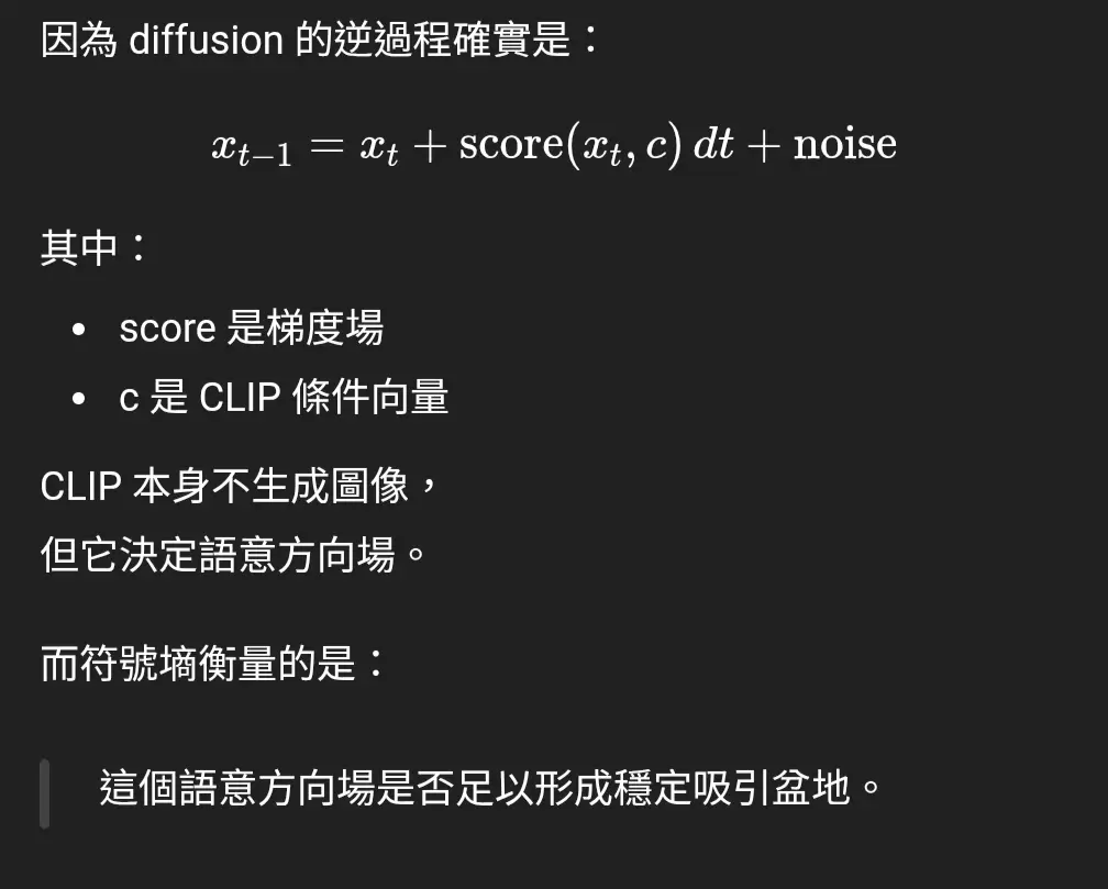 $\text{score}(x_t, c)$:代表梯度場(Gradient Field),它指引模型如何修正當前圖