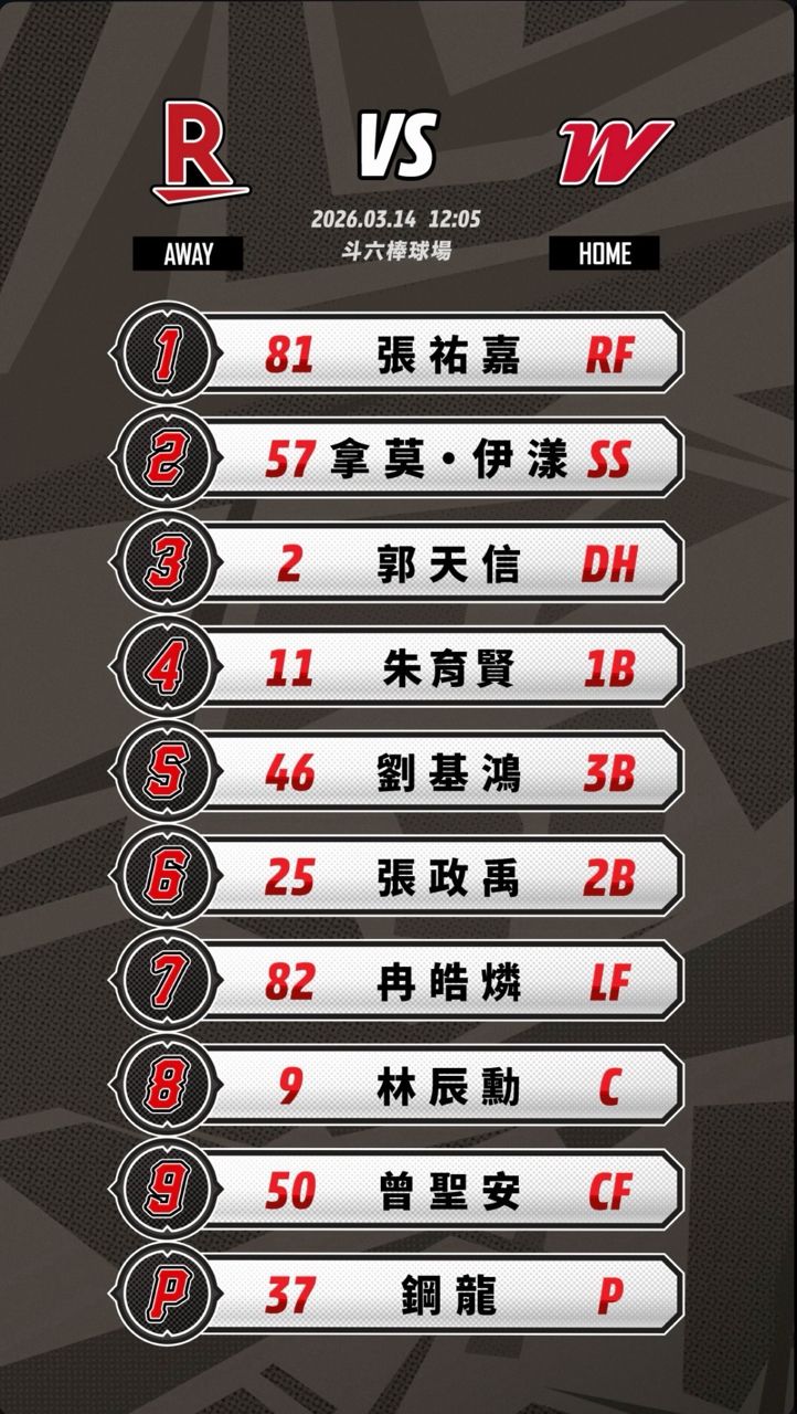 026官辦熱身賽 3/14(六) 12:05 樂天桃猿 vs 味全龍 斗六棒球場 味全龍今日在斗六棒球場與樂天桃猿交手,推派洋投鋼龍掛帥先發,搭配捕手為林辰勳, 一起關注比賽,替龍將們加油! https://i.mopix.cc/CWOlOP.jpg