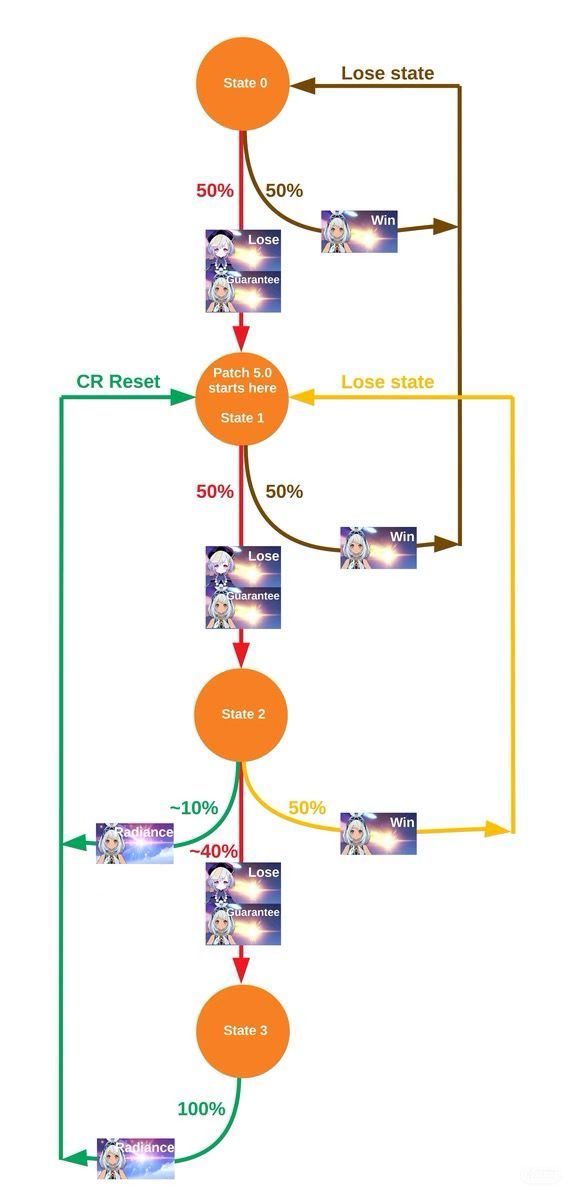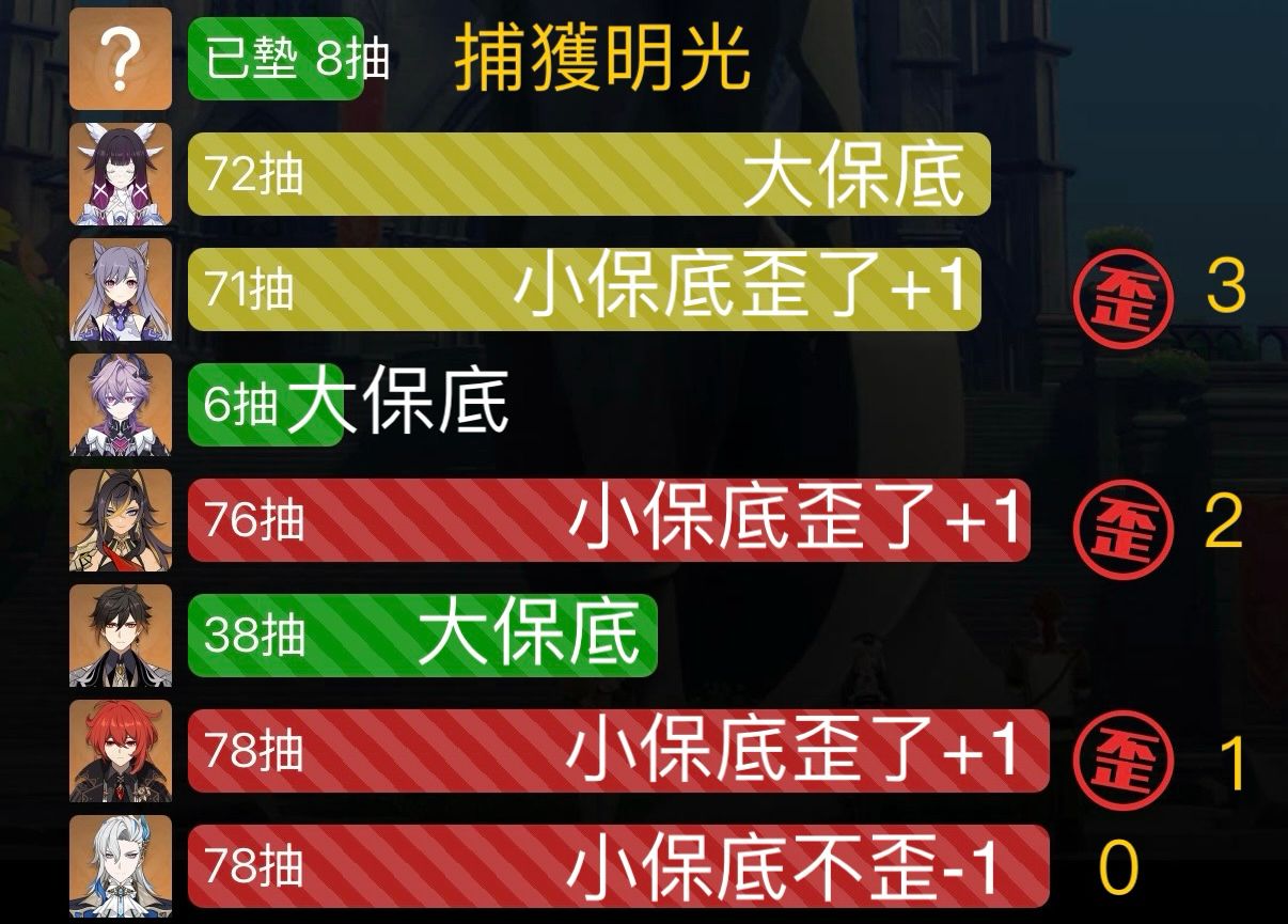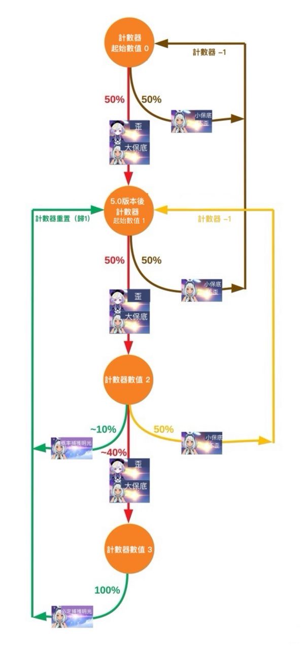 準確來說,5.0後默認所有人都是初始值1,歪一次+1 不歪一次-1這樣計算,計數器到達3 就會100%觸發 「從不歪後」這個說法比較不精準一點,因為你不知道這個「不歪後」的計數器數值是多 少, 如果這個不歪指的是捕獲明光,那計數器是歸1,如果是一般的小保底不歪,那可能是0或 1,總之還是要看完整抽卡紀錄來計算比較準